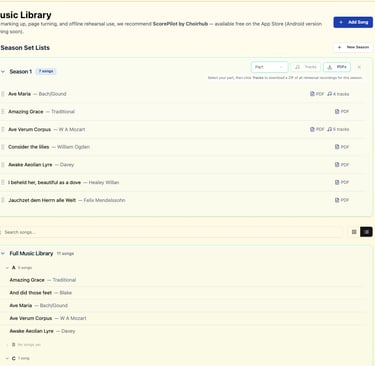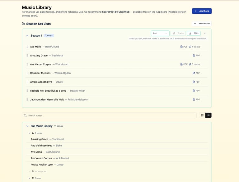 The Music Library is the heart of Choirhub. Upload your scores, rehearsal tracks and set lists once, then organise them by season, concert, folder or voice part. Singers can download complete, part-based rehearsal track playlists directly to their phone, making it easy to practise offline, anywhere. Everything lives in one central place, so everyone always knows exactly what to rehearse and when — no more searching through emails or guessing which file is current. Accessible on any device, the Music Library keeps rehearsals focused and singers prepared.