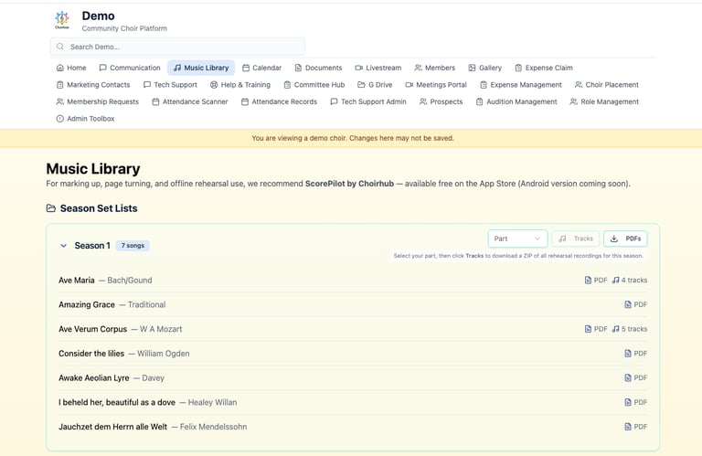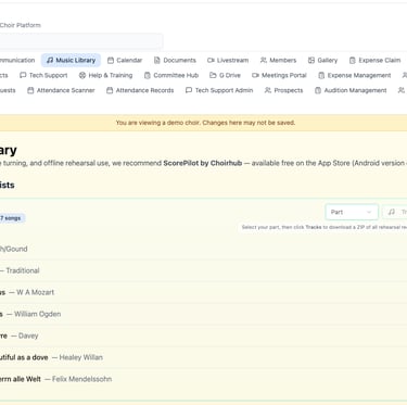 From music libraries and rehearsal tracks to member communication and attendance tracking, everything is organised in one place so your choir can focus on what really matters — making music.