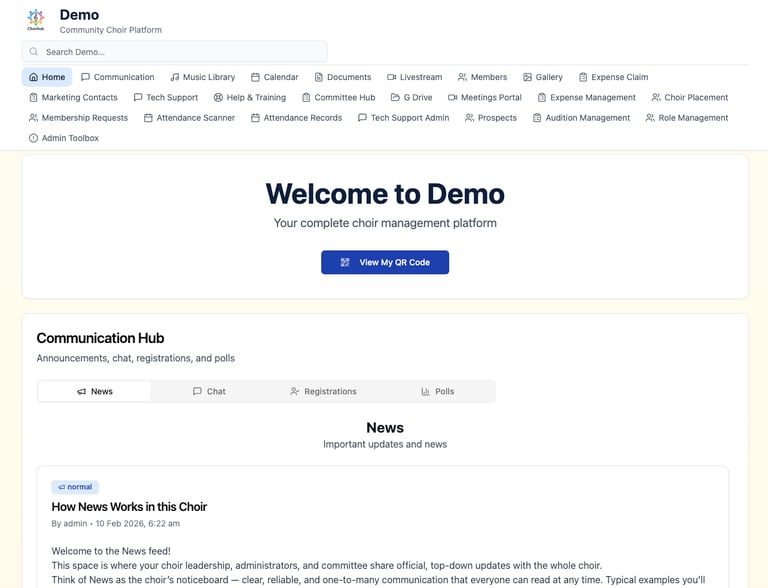 It was designed to solve the everyday administrative challenges that choirs face — organising music, communicating with members, tracking attendance and coordinating committee work.